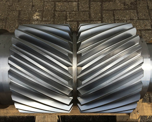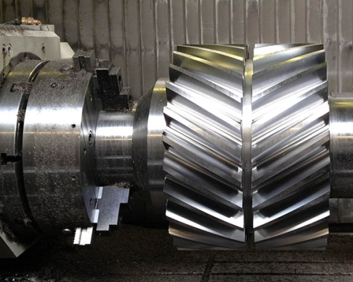 Wir produzieren Pfeilverzahnungen (Chevron / Herringbone / Sykes) bis zu einem Durchmesser von 5 Metern und auf langen Achsen/Wellen bis zu einer Länge von 8 Metern. Der Vorteil der Pfeilverzahnung liegt darin, dass die axiale Kraftkomponente unterbunden wird. Wir können einen Spalt freilassen – die traditionelle Methode – oder aber auch den Pfeil mithilfe einer 5-achsigen Simultanbearbeitung auch geschlossen ausführen.